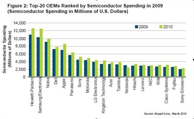 預(yù)計(jì)2010年惠普將是半導(dǎo)體支出最多的OEM廠商,它把諾基亞擠下去之后就一直保持這一位置。諾基亞2009年降到第三名。惠普今年的支出預(yù)計(jì)為126億美元,高于2009年時(shí)的109億美元。對(duì)于諾基亞來(lái)說,雖然智能手機(jī)大受歡迎,但2009年手機(jī)出貨量下降使其難以超過惠普,惠普依靠上網(wǎng)本而取得支出排行榜的第一名。
