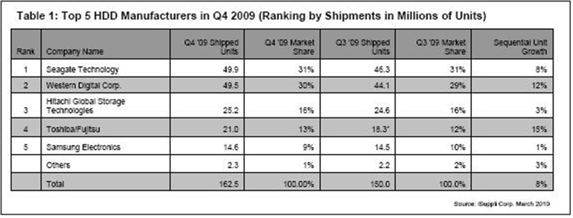 表1所示為2009年第四季度最大的五家硬盤制造商,按出貨量排名。
