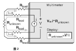 四線歐姆法是測(cè)量小電阻的最精確方法。用這種方法能自動(dòng)扣除測(cè)試線電阻和接觸電阻。四線電阻測(cè)量連接見(jiàn)圖2。使用一個(gè)已知電流源和測(cè)量電阻器產(chǎn)生的電壓,就能計(jì)算出未知電阻值。一組附加測(cè)試線用來(lái)承載至未知電阻器的電流,在它上面產(chǎn)生的電壓可通過(guò)電壓感應(yīng)線測(cè)量。沒(méi)有電流流過(guò)電壓感應(yīng)線,因此它也不會(huì)產(chǎn)生電壓降。