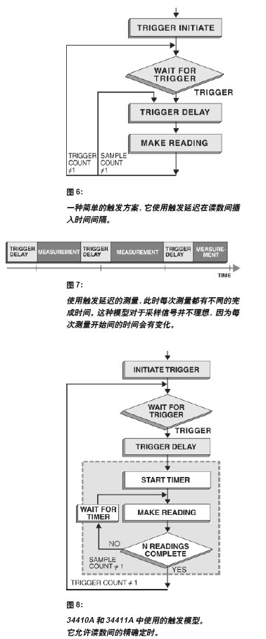 圖8示出第二種觸發(fā)模型。這是在34410A、34411A 和3458A 中使用的模型。它允許獨(dú)立設(shè)置觸發(fā)延遲和采樣間的時(shí)間。此外,用采樣環(huán)(n個(gè)讀數(shù))可更快地得到讀數(shù)和實(shí)現(xiàn)最小的時(shí)間變動(dòng)量。大多數(shù)采樣環(huán)在硬件中實(shí)現(xiàn),由最少的固件