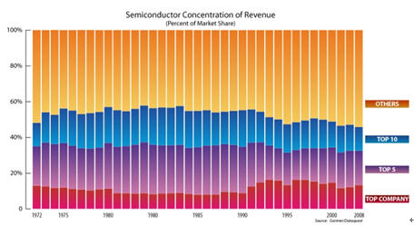 從全球前5位芯片供應(yīng)商總計(jì),從1960年以來變化很小, 都在33%左右,1972年時(shí)小於35%。如果再依前十位總計(jì), 變化也很少, 從1972年的48%,到2008年的46%。