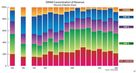 能夠看到的兼并主要集中在半導(dǎo)體的制造部分, 如在存儲器DRAM, 尤其是近10年來。從數(shù)據(jù)看DRAM供應(yīng)商中, 前1, 前3及前5及前10位從進(jìn)入新世紀(jì)以來它們的份額都在減少, 實(shí)際上近25年來它們己進(jìn)行了多次兼并。從1983年計(jì)(公司剛開始有DRAM數(shù)據(jù))DRAM的前1, 前3及前5的市場份額幾乎未變, 而依前10計(jì), 比1983年時(shí)還稍少了一些。