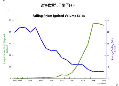 半導(dǎo)體在新應(yīng)用中增加滲透最有趣的例子是隨著市場應(yīng)用的銷售額增加,而芯片的價(jià)格卻不斷下降。如數(shù)碼相機(jī),其中使用的半導(dǎo)體主要是非揮發(fā)存儲器,圖像傳感器 。在1990年代初期,固態(tài)圖像傳感器的售價(jià)為20-25美元,直到最近10年,圖像傳感器的總市場銷售額,仍是很小,幾乎可忽略不計(jì)。在2000年代圖像傳感器的價(jià)格己從20-25美元下降到5美元。在這價(jià)格范圍時(shí),由于使用數(shù)量急速上升,使得在過去幾年中圖像傳感器的TAM達(dá)到半導(dǎo)體總銷售額的3%以上。在此同時(shí),NAND閃存價(jià)格每年下降65%, 主要是市場需求數(shù)量成正比增加。其結(jié)果是數(shù)碼相機(jī)的銷售額及其使用的半導(dǎo)體持續(xù)的增長。