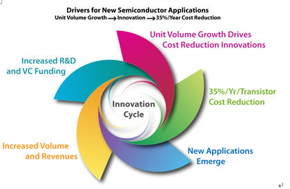 在新的應(yīng)用和市場增長推動(dòng)下,此種模式在半導(dǎo)體業(yè)中一次又一次的重復(fù), 即應(yīng)用數(shù)量的增長推動(dòng)了半導(dǎo)體芯片價(jià)格的下降。應(yīng)用市場的擴(kuò)大又推動(dòng)銷售額增大,進(jìn)而為發(fā)展新技術(shù)提供資金, 進(jìn)一步促進(jìn)成本的下降, 又能增加新的應(yīng)用市場誕生。如在數(shù)碼相機(jī)情況下, 低成本的固態(tài)圖像傳感器及存儲介質(zhì)推動(dòng)其銷售量的上升, 同樣能在數(shù)字?jǐn)z像, 安全系統(tǒng), 醫(yī)療中圖像處理, 汽車中及其它許多場合中得到大量的應(yīng)用。因此, 半導(dǎo)體TAM的增長不僅是因?yàn)榫w管的價(jià)格每年下降35%, 而是由于許多新的應(yīng)用市場的推廣共同促成。