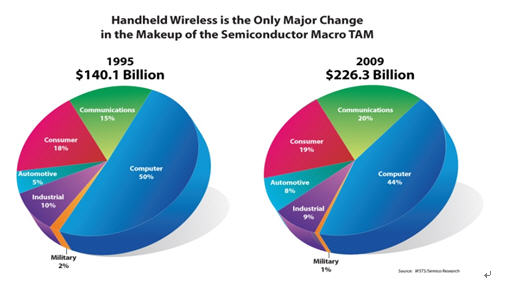 那么未來將會是怎么樣呢?只要晶體管的數(shù)量按目前的高增長倍率繼續(xù)走下去,各種新的應(yīng)用會層出不窮,推動(dòng)半導(dǎo)體市場總量進(jìn)一步提高。因此全球半導(dǎo)體市場在近15年來看似十分穩(wěn)定,雖然如臺式計(jì)算機(jī)市場已經(jīng)飽和,但是筆記本電腦和上網(wǎng)本開始流行,加上消費(fèi)類電子產(chǎn)品如游戲機(jī),平板電視,MP3, 數(shù)碼相機(jī)等, 由于半導(dǎo)體含量的增加推動(dòng)了半導(dǎo)體TAM的增加。
