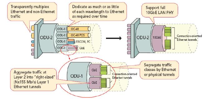 OTN含有的網(wǎng)絡(luò)功能和協(xié)議要求能夠滿(mǎn)足這些需求,以系統(tǒng)方式在光介質(zhì)上傳輸信息。本文重點(diǎn)介紹通過(guò)光纖承載傳送網(wǎng)和以太網(wǎng)載荷。建立同步數(shù)字體系(SDH)等OTN機(jī)制也在這一定義范圍之內(nèi),但是我們主要關(guān)注LAN到WAN的應(yīng)用,特別是40GbE和100GbE應(yīng)用(802.3ba)。出于這一標(biāo)準(zhǔn)化以及工作規(guī)劃的目的,所有OTN新功能以及相關(guān)技術(shù)都被認(rèn)為是電信標(biāo)準(zhǔn)局(ITU-T標(biāo)準(zhǔn))的工作范疇。