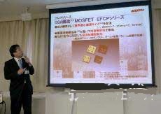 面向新聞媒體的發(fā)布會(huì)。三洋半導(dǎo)體的吉村充弘(高端器件事業(yè)部小型器件開(kāi)發(fā)部課長(zhǎng))介紹了此次的產(chǎn)品。攝影:Tech-On!。投影顯示的是三洋半導(dǎo)體的數(shù)據(jù)。上部的大尺寸封裝為EFC4615R,下部的小尺寸封裝為EFC4612