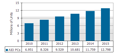 圖二:2010-2015年AIO PCs出貨量預(yù)測(cè)(單位:百萬(wàn)臺(tái))