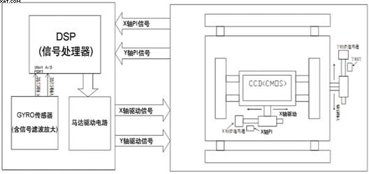 由圖2看出,在3D圖面上,Z軸有自動聚焦功能,Z軸移動對成像基本沒有影響,有影響是在X軸(PITCH)與Y軸(YAW)。圖4為在晚上拍照,無防手抖與有CCD防手抖的結(jié)果。圖5為CCD防抖系統(tǒng)框架,CCD防抖是在鏡頭上增加CCD支架,利用步進(jìn)馬達(dá)對X軸,Y軸的驅(qū)動,使CCD移動來補(bǔ)償CCD的抖動。MEMS陀螺儀選用要有X,Y軸Gyro芯片,內(nèi)部含放大,低通,高通濾波,這樣可以大大減少相機(jī)的尺寸。Gyro信號連DSP的ADport,DSP的AD是10bit,滿足設(shè)計要求。資料運(yùn)算用相機(jī)本身的DSP處理,可以減少一微處理器(Micro),降低成本。DSP對Gyro傳來的ω信息進(jìn)行運(yùn)算,計算補(bǔ)償量,通過馬達(dá)驅(qū)動電路驅(qū)動X,Y移動來達(dá)到補(bǔ)償?shù)哪康?。X軸,Y軸的PI信號是Lens反饋DSP信息來校正CCD與Lens中心重合,避免補(bǔ)償過程超出Lens設(shè)計的補(bǔ)償范圍。