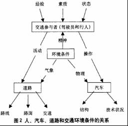 汽車道路交通事故是世界性的災害,因此汽車交通安全也是世界性的難題。道路交通事故引起人的傷亡,財產(chǎn)的損失,給國民經(jīng)濟也帶來了巨大的損失。然而誘發(fā)交通事故的因素是多方面的,它受汽車行車速度、道路條件、車輛狀況、駕駛員行為、駕駛員的文化素質(zhì)和自然環(huán)境等因素的綜合影響。其中人、汽車、道路、環(huán)境條件是影響道路交通安全的主要因素,它們之間的關(guān)系見圖2。