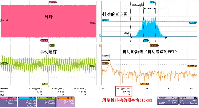 如下圖5為某100MHz時(shí)鐘在時(shí)域、頻域、統(tǒng)計(jì)域分析其TIE抖動(dòng)的示意圖。左上角的F2為某100MHz時(shí)鐘,P1是時(shí)鐘的TIE參數(shù)測量;右上角的F3是TIE抖動(dòng)的直方圖,直方圖不是高斯分布,可見時(shí)鐘存在固有抖動(dòng)。