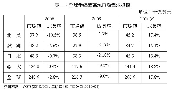 2009年全球半導體市場僅北美地區(qū)微幅成長1.7%,其他皆呈現(xiàn)負成長:亞太市場衰退3.5%,歐洲市場衰退21.9%,日本市場衰退21.0%。不景氣使得下游電子產(chǎn)品品牌大廠,如Dell、HP、Sony等廠商增加產(chǎn)品委外代工之比例,以降低生產(chǎn)成本,增加其產(chǎn)品競爭力。因此,2009年主要從事代工生產(chǎn)之亞太地區(qū),才會出現(xiàn)僅小幅衰退之情形。至于北美地區(qū)則是因為受到下游品牌廠商降價促銷成功,使得市場呈現(xiàn)小幅成長。