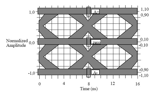 本次測(cè)試將主要驗(yàn)證產(chǎn)品上4個(gè)以太網(wǎng)100Base-TX接口的技術(shù)指標(biāo)。對(duì)于其中比較直觀的100Base-TX物理層的眼圖模板,《ANSI+X3_263-1995》標(biāo)準(zhǔn)中有著明確的眼圖模板定義見(jiàn)圖2。