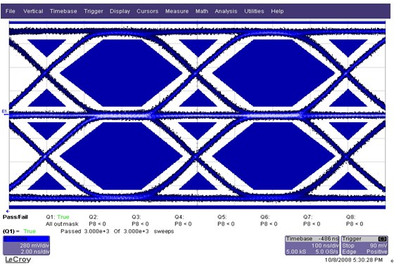 關(guān)于100Base-TX接口技術(shù)指標(biāo)的測(cè)試方法,《IEEE Std 802.3-2000》標(biāo)準(zhǔn)中也有詳細(xì)的說(shuō)明, 工程師按照誘導(dǎo)發(fā)包的測(cè)試方法進(jìn)行了網(wǎng)口眼圖的測(cè)試,測(cè)試過(guò)程中發(fā)現(xiàn)測(cè)試網(wǎng)口出現(xiàn)了信號(hào)波形碰觸模板的問(wèn)題,波形見(jiàn)圖3: