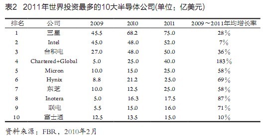 又據(jù)FBR市場調(diào)研公司發(fā)表的報告,世界半導(dǎo)體業(yè)的總投資額2009~2011年分別為257億美元、406億美元和495億美元,和Gartner公司所報基本相同。該公司又稱,這3年世界最大25家半導(dǎo)體公司的投資,占到整個半導(dǎo)體業(yè)投資的近90%。2009~2011年世界投資最多的l0家半導(dǎo)體公司如表2所示。