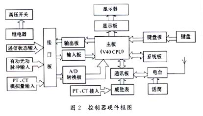 該終端控制器的硬件結(jié)構(gòu)如圖2所示,它的主體是一臺(tái)STD工控機(jī),采用模板式結(jié)構(gòu),便于故障檢修。供電線路的電壓、電流經(jīng)PT、CT變換后經(jīng)A/D轉(zhuǎn)換板轉(zhuǎn)變?yōu)閿?shù)字信號(hào)送至V40主板,PT、CT變比經(jīng)主臺(tái)設(shè)定后下發(fā)至該終端,CPU據(jù)此計(jì)算出線路的實(shí)際電壓、電流。脈沖電度表發(fā)出的脈沖信號(hào)經(jīng)輸入板送至CPU,根據(jù)電表脈沖常數(shù)計(jì)算出有功及無功功率。KG105型電臺(tái)接收主臺(tái)下發(fā)的指令,經(jīng)通訊板送至CPU,然后由輸出板控制輸出繼電器的動(dòng)作,進(jìn)而實(shí)現(xiàn)遙控跳合閘操作。遠(yuǎn)程抄表是由電臺(tái)經(jīng)通訊板采集威勝表中的數(shù)據(jù)實(shí)現(xiàn)的,而召測數(shù)據(jù)則是采集CPU中計(jì)算出的數(shù)據(jù)。CPU每隔1min采集1次數(shù)據(jù),所有計(jì)算結(jié)果保存在系統(tǒng)板上的SRAM中,可保存24小時(shí)的數(shù)據(jù),因此主臺(tái)第二天必須將第一天的數(shù)據(jù)召測回中心站的數(shù)據(jù)庫中,否則第一天的數(shù)據(jù)將丟失。