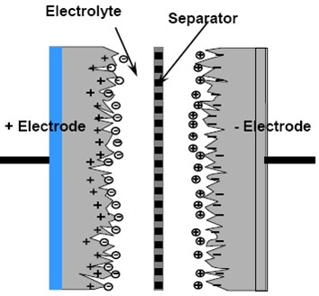 超級電容器可以被視為在兩個極板外加電壓時被電解液隔開的兩個互不相關(guān)的多孔板。對正極板施加的電勢吸引電解液中的負(fù)離子,而負(fù)面板電勢吸引正離子。這有效地創(chuàng)建了兩個電荷儲層,在正極板分離出一層,并在負(fù)極板分離出另外一層。