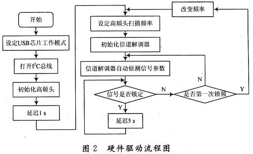 硬件驅(qū)動程序是系統(tǒng)設計中很關鍵的一個部分,它直接關系到各硬件芯片是否能正常穩(wěn)定的工作。硬件的驅(qū)動是由主控芯片來完成,在本方案中將uSB傳輸控制芯片CY7C68013作為主控芯片,它內(nèi)置增強型的8051內(nèi)核,通過I2C總線來控制前端的高頻頭和信道解調(diào)芯片,完成對前端的驅(qū)動。
