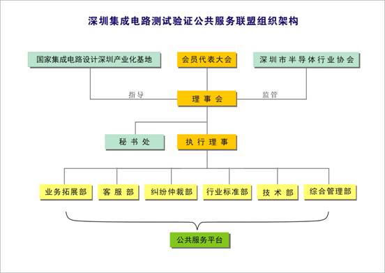 如上圖所示,會員代表大會由IC設(shè)計(jì)公司,封裝測試廠,設(shè)備廠商,高校,研究所和電子制造工廠代表組成,是深圳集成電路測試驗(yàn)證公共服務(wù)聯(lián)盟的最高權(quán)力機(jī)構(gòu),下設(shè)理事會,理事會是聯(lián)盟管理的智囊團(tuán),各種規(guī)章制度的起草者和重大事務(wù)的決策者,其下又設(shè)執(zhí)行理事和秘書處,執(zhí)行理事負(fù)責(zé)日常事務(wù)的實(shí)際運(yùn)行,是公共服務(wù)聯(lián)盟的操作單位,秘書處主要負(fù)責(zé)會員代表大會的召開以及日常會員事宜的組織,執(zhí)行理事又下設(shè)業(yè)務(wù)拓展部、客服部、糾紛仲裁部、行業(yè)標(biāo)準(zhǔn)部、技術(shù)部和綜合管理部。