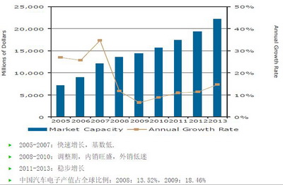 去年汽車電子一枝獨秀,增長了13.2%。汽車電子目前看來經(jīng)歷了三個時期:2005年—2007年處于快速成長期,年增長率超過30%,2008年—2010年處于調(diào)整期,2010年—2013年將會是穩(wěn)步增長期。中國汽車電子產(chǎn)值占全球比例上升速度比較快,2008占13.52%,而2009已經(jīng)占到18.46%。