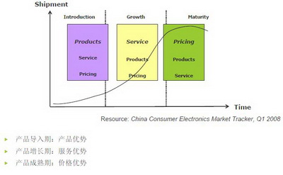 對原廠來說,市場開發(fā)策略會隨著產(chǎn)品的不同生命周期而發(fā)生變化。在產(chǎn)品導(dǎo)入期,產(chǎn)品的優(yōu)勢最為突出,此時穩(wěn)定產(chǎn)品性能和表現(xiàn)最重要,在產(chǎn)品增長期,競爭漸多,客戶的要求也開始提高,產(chǎn)品本身的優(yōu)勢可能最多3月甚至1個月就被競爭對手追趕或超過。在產(chǎn)品增長期末端和產(chǎn)品成熟期,市場差異化的空間已經(jīng)不大,上下游趨于集中,此時原廠經(jīng)過激烈競爭后已經(jīng)只剩幾家寡頭,市場進入拼價格的階段,這個時候,價格決定一切,原廠開始突出價格優(yōu)勢。