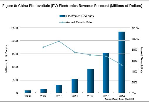 隨著政府補(bǔ)貼計劃在2010年達(dá)到頂點(diǎn),光伏電子市場也將同時觸頂。盡管預(yù)計接下來三年年增長率下降——除非出臺新的政策,但該市場將繼續(xù)保持一定的勢頭,足以在2014年實(shí)現(xiàn)24億美元的銷售收入。