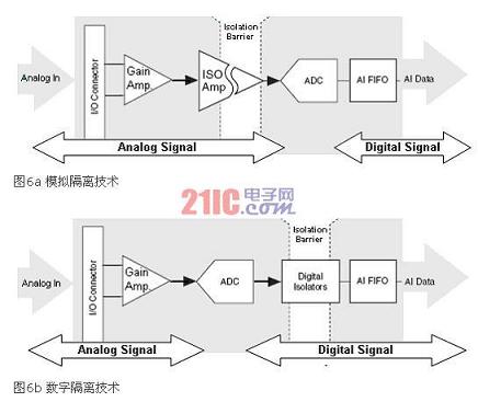 現(xiàn)今,許多商業(yè)現(xiàn)成可用(COTS)組件都含有上述隔離實(shí)現(xiàn)技術(shù)之一。對(duì)于模擬I/O通道,您可以在模數(shù)轉(zhuǎn)換器(ADC)完成信號(hào)的量化處理之前(模擬隔離)或之后(數(shù)字隔離)在設(shè)備的模擬部分實(shí)現(xiàn)隔離功能。根據(jù)您的隔離實(shí)現(xiàn)在電路中位置的不同,您需要依據(jù)其中的一種技術(shù)來(lái)設(shè)計(jì)不同的電路。您可以基于您的數(shù)據(jù)采集系統(tǒng)性能、成本和物理需求,選擇模擬或數(shù)字隔離技術(shù)。圖6a和6b展示了實(shí)現(xiàn)隔離功能的不同階段。