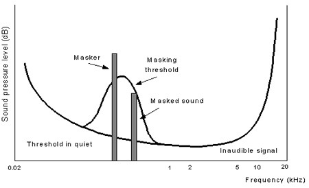 它們使用了三大關鍵技術。當要剔除低于最小聽覺閾值的聲音時,使用頻率屏蔽技術。當一個大幅度信號非常接近另一個較低幅度的信號時,使用幅度屏蔽技術。從而小信號被大信號屏蔽,因此小信號將不被編碼。最后,當不同音調在時間上非常接近時,使用時間屏蔽技術。從而可屏蔽掉在一個較柔和聲音前或后的高音,并把它丟棄掉。