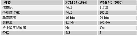 在過去的15年里,ADC和DAC系統(tǒng)的性能一直在穩(wěn)定地增長。下面的音頻DAC表簡要列出了今天最先進的DAC和1986年最先進的DAC之間的性能比較?,F(xiàn)在,將廣泛的數(shù)字濾波技術集成進今天的DAC轉換器中不僅在技術上是可行的,而且也非常經濟。如WolfsonMicroelectronics公司的DAC器件WM8740具有完全支持最新DVD-Audio標準、CD和其它使用PCM格式數(shù)據(jù)的數(shù)字音頻系統(tǒng)的架構。