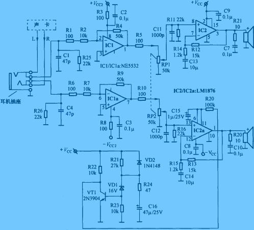 IC1及周圍元件組成緩沖放大級,電路增益=R4/(R1+R2)=50/(10+0.1)≈5倍。為了避免在電腦關機后,在聲卡停止工作時,前置放大器輸入端懸空,處于高阻抗輸入狀態(tài),將感應到的50Hz交流電信號送到后級電路放大,從而在揚聲器中出現(xiàn)較強的噪聲,特設置了22kΩ電阻R25、R26,這樣不但可以將輸入阻抗限制在22kΩ,避免前置電路工作在高阻抗狀態(tài),還可以對50Hz感應信號進行有效的抑制,提高整機信噪比。