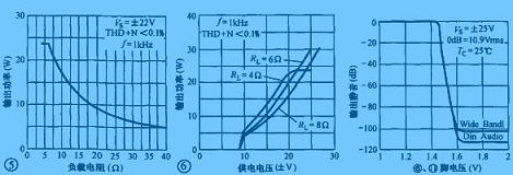 LM1876的負載范圍很寬,在4~30Ω的范圍內均能穩(wěn)定地工作,其輸出功率與負載的對應關系如圖5所示。LM1876的供電電壓范圍為±10~±25V,當供電電壓降低時,影響的只是輸出功率的大小,而對其他指標影響不大,供電電壓與輸出功率的對應關系如圖6所示。LM1876的6、11腳為左/右聲道靜噪控制端,當這幾腳接高電平(高于1.6V)時,LM1876內部電路執(zhí)行靜音操作,切斷輸出端的音頻信號(如圖7所示)。因此可以在這些引腳中與正電壓之間接一個RC延時網絡,使其在開機瞬間為高電平,輸出電路無音頻信號輸出,延時一段時間后,再正常輸出,以達到避免開機瞬間輸出端電位失諧對揚聲器的沖擊。在圖4中,晶體管VT1、R24、C16、R20、C15即為開機延時網絡,調整它們的取值范圍,可以改變延時時間的長短,從而獲得滿意的開機延時時間。