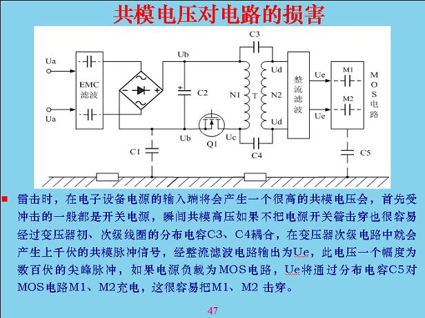 下面講一下共模電壓對電路的損害。其實共模電壓對開關電容前面的影響不是很大,最大是后面一點,通過電壓器分布電路,以前的模式電路電壓用得很低,都是1v-5v左右,納米級容易擊穿,電容也相當小。從里面串進去的電壓經(jīng)過濾波不斷的吸收降下來,一般有上千伏,容易把后面的擊穿。在實踐過程中為了防雷,這幾個位置最好在上面布一個雷點電容,對防雷電擊穿很有效。共模電壓進去以后瞬間擊穿,如果電子沒斷開,外面的電流會繼續(xù)延續(xù)下去把它燒掉,如果備一個電容上去,共模電容通過電容一下子把它吸收掉,讓幾個電容互相通電位,幾個模組不會那么容易擊穿。