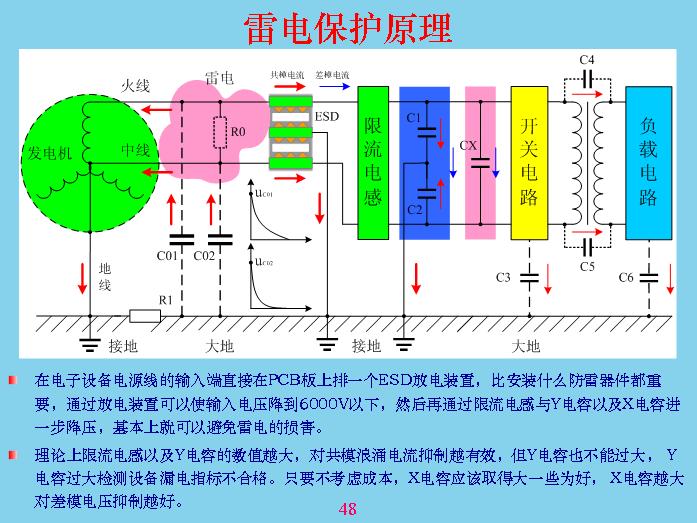 大家想想看,跟前面我們所說的,感應雷這個東西沒有一個標準的概念說什么叫做感應雷。只要打雷的話,外面打雷,窗戶上面的金屬,如果夜間都可以看到放電產(chǎn)生火花,這就是通過電磁感應產(chǎn)生的位移電流原理。從原理上來說,三相四線或三相五線,發(fā)電機有中線接地,設備使用者的外殼接地是最有效的避雷方法,但現(xiàn)在很多設備都不接地,沒有辦法接,只有很貴重的進口設備用三相電源,中間那一條地線,地線不是中線,大家要搞清楚。中線雖然是接地的,但在這里不能當成地線,地線一定是自己大樓本身的地,而且要量好接地的地線。因為地線接進去以后,大樓對外面的電磁層進行屏蔽了,大樓相對來說也是導電的,就算不導電,現(xiàn)在國家都有安全要求,大樓超過多少層都要加上避雷針,就是防雷的。如果不能接地,你就要考慮充放電的問題。前面最好的共模電容我覺得還是要,我認為這個共模電容最好連接上,不能接大地,要接在外殼上,接到外殼上有什么好處?共模電壓一進來,雖然電流沒有通過地放電回路,把電壓舉高起來了,與外面輸入電壓是一樣的,外殼電壓取的一樣,起到了屏蔽作用。如果這個接地的話會更加安全,但是地線要足夠粗,回路也足夠,因為放電的電流很大,很容易燒掉。這幾個東西是經(jīng)過很多年的試驗,8是很成熟的東西,不管做共模還是防雷都要做上,如果連機殼都沒有,只是塑料殼,也要考慮這根線接到什么位置最好?是接到里面面積最大的地方,就是公共地面積最大的地方,讓電位舉起來,其他電位差不會產(chǎn)生很大的電容回路。主要是考慮充放電回路,電流越小越好,兩個電位差越小越好。