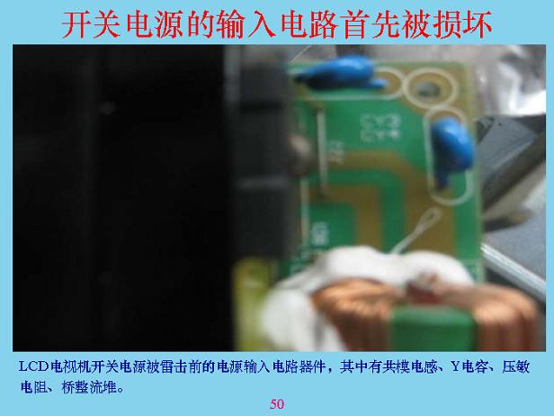 下面我們講一些具體的。這是一個開關電源,開關電源被雷劈的時候,輸入回路基本上都燒了,假如沒燒是什么樣的?可以看看,這是橋堆,這兩個是Y電容,這里面還有一個壓敏電阻。這是共模線圈,雷劈以后全部燒了,說明壓敏電阻沒有起到什么保護作用,兩個電容都燒了,說明電感相當、相當?shù)馗?。為了防止雷電,首先前面一定要加一個能量吸收,比較大的東西,成本相對來說比較低,像試驗站里面的放電裝置,那個東西沒有地方裝,也貴得很。在硬紙板上面排幾個鋸齒,中間隔一個頭就行了。如果中間隔6mm也可以。有一個一級電感,電感可以使瞬間上去很快的電壓降下來,突然加一個1萬伏、10萬伏,加上去只有這兩端,另外兩端建立不起來,所以剛加進去的時候對雷電來說,大部分能量都被吸收掉了。后面經(jīng)過這個以后,剩余部分通過共膜電容繼續(xù)吸收,吸收完以后還有差模部分,產(chǎn)生的差模部分通過電容把差模吸收掉。共模電容和差模電容具有抑制傳導干擾的作用,對雷電也有抑制作用,所以很多人也在問,電容接到前面好還是接在后面好?這個東西看你有什么作用,如果只是為了防EMI電磁干擾的話,接在越前面越好,接在測試儀表的輸入端最好,接到那里把信號全部短路掉了,就看不到了。但是對于雷電,你接到后面要好很多,所以這主要是防雷的,你就不要考慮電磁干擾和EMC了,盡量把兩個放在后面。