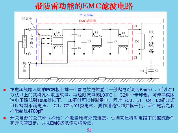 按照道理EMI是電磁干擾,避雷元器件按照道理并不聯(lián)系在一起,但EMC濾波里面,與EMC濾波器同樣有防雷功能,就是前面的幾個電感和共模電容還有差模電容對防雷都起到作用,大家要理解,EMC濾波是用于設備上的,但反過來考慮雷電的時候,你就要把干擾信號從外面輸進來,要這樣考慮了,不能單方面,最好在防雷加上一個放電裝置加在電感后面,共用共模濾波電容。