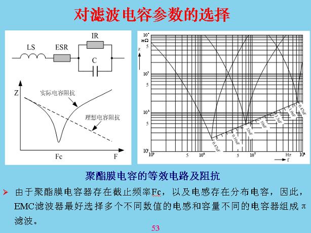 對于濾波電容,大家注意前面的EMC濾波,這個電容不是理想電容,里面有一個電感,還有漏電電阻,里面有串聯(lián)電阻,電感和電容有沒有產(chǎn)生串聯(lián)諧振?曲線是這樣一條斜線,串聯(lián)諧振相當于把信號短路掉了,信號短路的阻礙很大,這里面有一個最佳值,然后成為感線,進行EMC電路設計的時候最好用不同的電容進行配模,這是0.4的曲線,33nF并聯(lián)就可以保證在上面不是好的,單獨一個電容后面覆蓋不到,以后有機會我講這些元器件,你們在大學里面學的是符號,對電阻電容基本是不懂的,還有電組電容這方面的問題最多,還有電容,電容來回極化的時候,速度跟不上外面的變化,會損耗相當大,會燒壞,特別是脈壓電容,很多人認為體積越小越好,但沒有考慮在開關上容易出現(xiàn)問題。