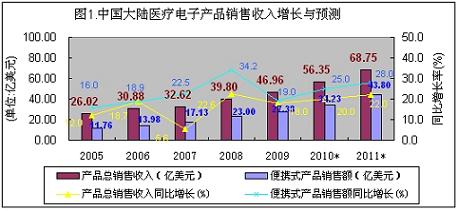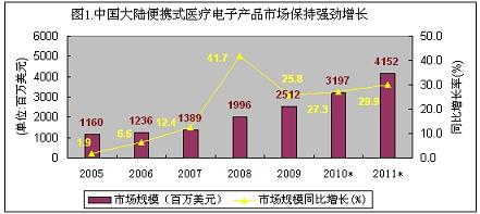 2005-2009年,中國(guó)大陸便攜式醫(yī)療電子產(chǎn)品市場(chǎng)呈現(xiàn)出加速增長(zhǎng)勢(shì)態(tài),年復(fù)合增長(zhǎng)率高達(dá)30.8%,幾乎沒有受到金融危機(jī)的影響。2009年市場(chǎng)總規(guī)模達(dá)到25.12億美元,增長(zhǎng)速度達(dá)到25.8%占醫(yī)療電子產(chǎn)品總市場(chǎng)的53.2%。在便攜式醫(yī)療電子市場(chǎng)中,家用的占六成以上的份額,電子血壓計(jì)、便攜式血糖儀和電子助聽器占據(jù)了90%以上的銷售份額。由于目前市場(chǎng)處于普及的初級(jí)階段,中國(guó)人口基數(shù)大,國(guó)人健康意識(shí)的提升,整個(gè)便攜式醫(yī)療電子市場(chǎng)需要面對(duì)的是中國(guó)內(nèi)需市場(chǎng),不存在市場(chǎng)飽和所謂的受金融危機(jī)影響。所以家用便攜式醫(yī)療電子產(chǎn)品市場(chǎng)前景非常好,便攜式、信息化、低功耗、低成本以及安全性是市場(chǎng)關(guān)注的熱點(diǎn)。展望未來(lái),中國(guó)便攜式醫(yī)療電子市場(chǎng)前景非常誘人,在未來(lái)兩年,中國(guó)便攜式醫(yī)療電子產(chǎn)品市場(chǎng)規(guī)模年復(fù)合增長(zhǎng)率可接近30%,2010年市場(chǎng)規(guī)模將接近32億美元,2011年會(huì)超過40億美元。(見下圖)。