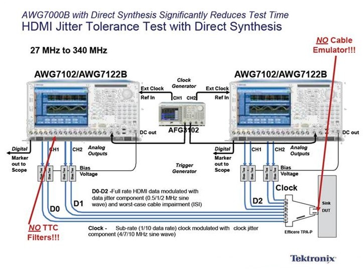 圖2:泰克獨(dú)一無(wú)二的AWG7000B直接合成方案可替換和省去所有類型的線纜仿真器和多達(dá)40個(gè)TTC濾波器,大幅降低HDMI接收端抖動(dòng)容限測(cè)試的復(fù)雜度,并有效降低成本。