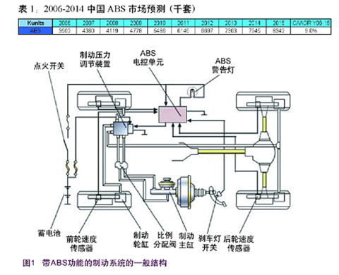 隨著經(jīng)濟(jì)的不斷發(fā)展,人們對汽車的需求正日益加強(qiáng),與之相應(yīng),汽車的消費群體也變得越來越成熟,主要表現(xiàn)在消費者除了關(guān)注汽車的外型外還越來越重視汽車的內(nèi)在品質(zhì),其中,汽車的安全特性逐漸成為用戶考慮的首要選購條件。由此,作為主要的安全系統(tǒng)之一的汽車防抱死制動系統(tǒng)(ABS)正引起越來越多的關(guān)注。下表(表1)是世界著名咨詢公司StrategyAnalytics對中國ABS市場的預(yù)測,從中我們可以明顯地看出這種不斷增長的趨勢,預(yù)計在2006-2015年期間中國的ABS市場的年復(fù)合增長率將達(dá)到9.0%。