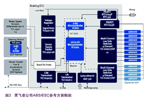 英飛凌在與世界主要ABS/ESC供應(yīng)商的合作過程中不斷總結(jié)經(jīng)驗,并結(jié)合自己全面的產(chǎn)品線,開發(fā)出了獨具特色的ABS/ESC參考方案供客戶在此基礎(chǔ)上開發(fā)自己的方案。經(jīng)過日積月累地改進(jìn)這個方案目前的版本如下圖所示(圖2)。這個方案圖中包括了ABS和ESC兩種方案。整個圖描述的是一個ESC系統(tǒng),如果去掉方向盤轉(zhuǎn)角傳感器、橫擺角傳感器和加速度傳感器組以及右下角用來控制四個額外電磁閥線圈的芯片,剩下的器件組成的就是一個ABS系統(tǒng)。
