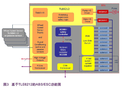 目前ABS/ESC系統(tǒng)正經(jīng)歷著快速發(fā)展階段,比如輪速傳感器正從被動式傳感器向主動式傳感器轉(zhuǎn)換,使用功能更強(qiáng)大的微控制器,在系統(tǒng)中加入備份微控制器等等。從性能上說,上述的方案完全滿足了ABS/ESC對主控單元的要求。但是,隨著汽車工業(yè)的快速發(fā)展,對汽車的可靠性和輕量化的要求也在不斷地提高。此外,幾乎所有的廠商都面臨著削減成本的壓力。上述方案由于采用全分立式器件設(shè)計,所以器件的數(shù)目較多,從整個系統(tǒng)來看成本較高且主控單元有存在故障的可能性。另外,整個主控單元的體積可能較大。