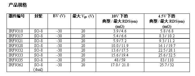 全球功率半導(dǎo)體和管理方案領(lǐng)導(dǎo)廠商 – 國(guó)際整流器公司 (International Rectifier,簡(jiǎn)稱(chēng)IR) 推出新系列-30 V器件,采用 IR最新的SO-8封裝 P 溝道 MOSFET硅組件,適用于電池充電和放電開(kāi)關(guān),以及直流應(yīng)用的系統(tǒng)/負(fù)載開(kāi)關(guān)。新款 P 溝道器件的導(dǎo)通電阻 (RDS (on)) 為 4.6 m?至59 m?,可匹配廣泛的功率要求。P 溝道 MOSFET 無(wú)需使用電平轉(zhuǎn)換或充電泵電路,使其成為系統(tǒng)/負(fù)載開(kāi)關(guān)應(yīng)用非常理想的解決方案。