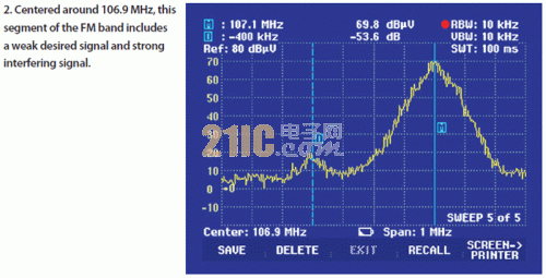 在不同的發(fā)生器1頻率設置點觀察到以下現(xiàn)象:如果測試裝置有限制因素,那么音頻的信噪比(SNR)不會隨著干擾射頻信號的遠離而變化。如表所示,接收機的去靈敏作用是由強大的干擾源引起的,從而證明來自測試裝置的噪聲不是106.7MHz測試頻率點的限制因素。
