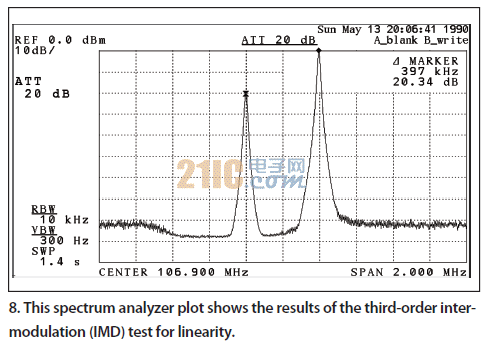 在使用系統(tǒng)之前要對測量裝置進行測試,以便確認測量裝置不會引起任何可能降低測量精度的顯著噪聲或失真。還要通過調(diào)整相對的插入值對功率電平進行校準。指定電平在合成器輸出端——收音機天線連接點進行測量。線性度在要求的信號電平之上測量,要做到這一點,必須將兩個發(fā)生器在各自頻率處設為CW模式,并且總功率電平要超過測試案例中使用的值。參考圖8,發(fā)生器1被設為0dBm,發(fā)生器2被設為-20dBm。這里沒有可測量的三階互調(diào)(IM3)。圖7描述了被設為接近最大測試條件的信號。