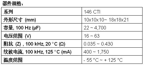 新款146 CTI電容器具有最苛刻的回流焊曲線,提供從10mmx10mmx10mm至更大的18mmx18mmx21mm的8種外形尺寸。今天發(fā)布的器件的高溫性能達(dá)+125℃,在100kHz和+20℃條件下的阻抗為0.035Ω~0.430Ω,在100kHz和+125℃條件下的紋波電流為400mA~1750mA,在+125℃下的使用壽命長(zhǎng)達(dá)6000小時(shí)。