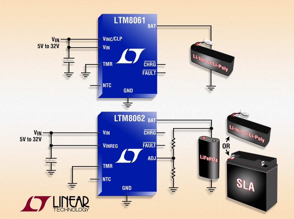 為了保持電池處于滿充電狀態(tài),一旦電池電壓降至比浮置電壓低 2.5% 時,LTM8061 和 LTM8062 就自動啟動再充電周期。安全功能包括壞電池檢測和具故障指示并適用于 LED 的 NTC 電阻器輸入。當電源不存在時,內部輸入反向電壓隔離二極管可用來防止電池的泄漏電流。LTM8061 和 LTM8062 采用 RoHS 兼容的 9mm x 15mm x 4.32mm LGA 封裝,千片批購價分別為每片 8.85 美元和 9.85 美元。