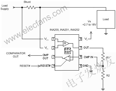 在許多應(yīng)用中,電流應(yīng)與某個(gè)設(shè)定值相比較。通常說來,進(jìn)行電流比較還需要電流分路監(jiān)控器、比較器和參考電壓。此外,理想的比較器輸出應(yīng)與大多數(shù)常見的邏輯電路很好地兼容。圖5給出了電流比較的例子。在本例中,將電流與采用TIINA200系列電流分路監(jiān)控器和比較器的簡單單電壓結(jié)點(diǎn)進(jìn)行了比較。R1和R2形成分壓器,以根據(jù)INA200系列比較器的內(nèi)置0.6V電壓結(jié)點(diǎn)來設(shè)置電壓結(jié)點(diǎn)。(INA200系列的增益很有特點(diǎn):INA200的增益為20,INA201的增益為50,INA202的增益為100。)