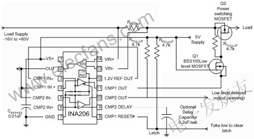圖6在該雙電平電流比較電路中,低電平延遲輸出可對即將發(fā)生的過載發(fā)出警報(bào),支持鎖存功能的上限可將負(fù)載電源關(guān)閉。