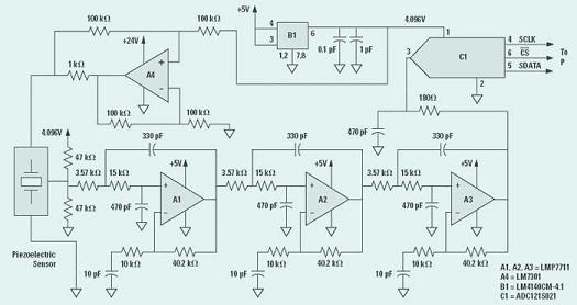 ADC121S021是一款設(shè)有串行外圍接口(SPI)的12位、200kSPS單端輸入轉(zhuǎn)換器。型號(hào)為L(zhǎng)M4140ACM-4.1的另一款高精度電壓參考電路可為這款模擬/數(shù)字轉(zhuǎn)換器提供電壓參考,并為濾波放大器提供偏壓,并設(shè)置濾波器的偏置電壓為模擬/數(shù)字轉(zhuǎn)換器輸入電壓范圍的一半。傳感器的輸出屬于交流電信號(hào),而中度的電平偏移可將信號(hào)轉(zhuǎn)移到模擬/數(shù)字轉(zhuǎn)換器輸入電壓范圍內(nèi)的中央位置。LM4140芯片也可為L(zhǎng)M730132V通用放大器(即A4放大器)所輸出的壓控電流提供電壓參考。傳感器內(nèi)置的MOSFET可為壓電傳感電路提供緩沖。A4放大器負(fù)責(zé)輸出電流,以便驅(qū)動(dòng)組成為共源級(jí)放大器的MOSFET,而有關(guān)晶體管則通過(guò)交流耦合與輸出終端裝置連接在一起。