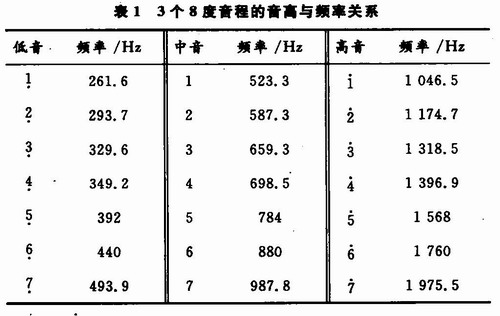 分析表1可見,表中3個(gè)不同音程相同音名(同一行)的信號(hào)頻率都相差一倍。